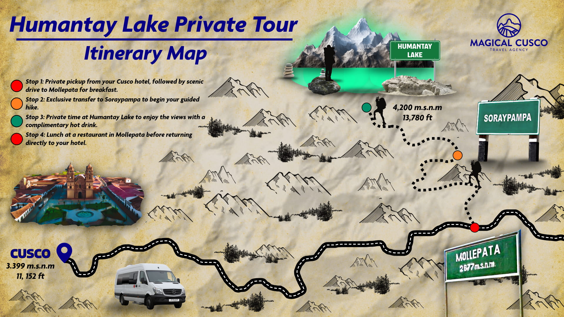 - We provide private transport from Cusco to Soraypampa, making your Humantay Lake Private Tour comfortable and hassle-free with breakfast and lunch included.